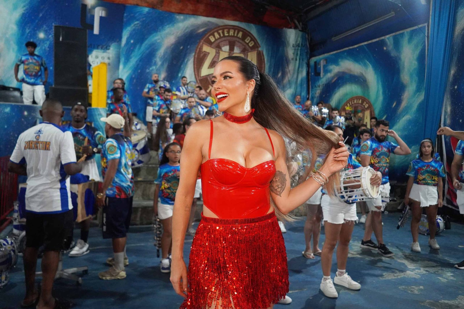 Carla brilhou com um look vermelho vibrante, que uniu glamour, ousadia e conforto. A Rainha apostou em um corpete estruturado de vinil, que realçou sua silhueta com elegância, combinado com uma saia de franjas brilhantes, que refletiam a luz a cada movimento, dando ainda mais vida ao seu samba no pé. Para completar o visual, a apresentadora escolheu tênis brancos bordados com pedrarias, uma escolha moderna e prática, perfeita para a maratona de ensaios. O toque final ficou por conta de um rabo de cavalo impecável e uma maquiagem sofisticada, destacando os lábios vermelhos, que harmonizaram com o brilho da produção.