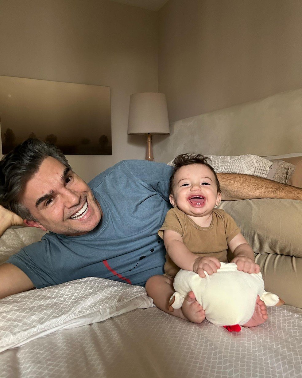 O ator Jarbas Homem de Mello, de 54 anos, se derreteu nas redes sociais ao publicar uma foto com o caçula, Luca, na tarde desta quinta-feira (9). Com oito meses de vida, o filho do astro com Claudia Raia, 56, abriu um sorrisão ao posar ao lado do pai.